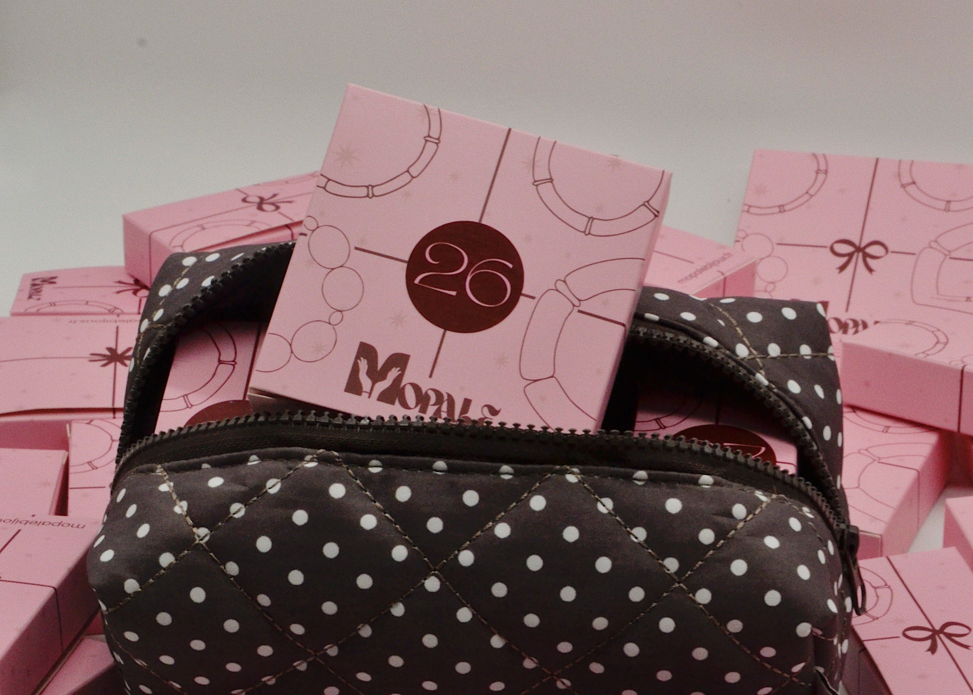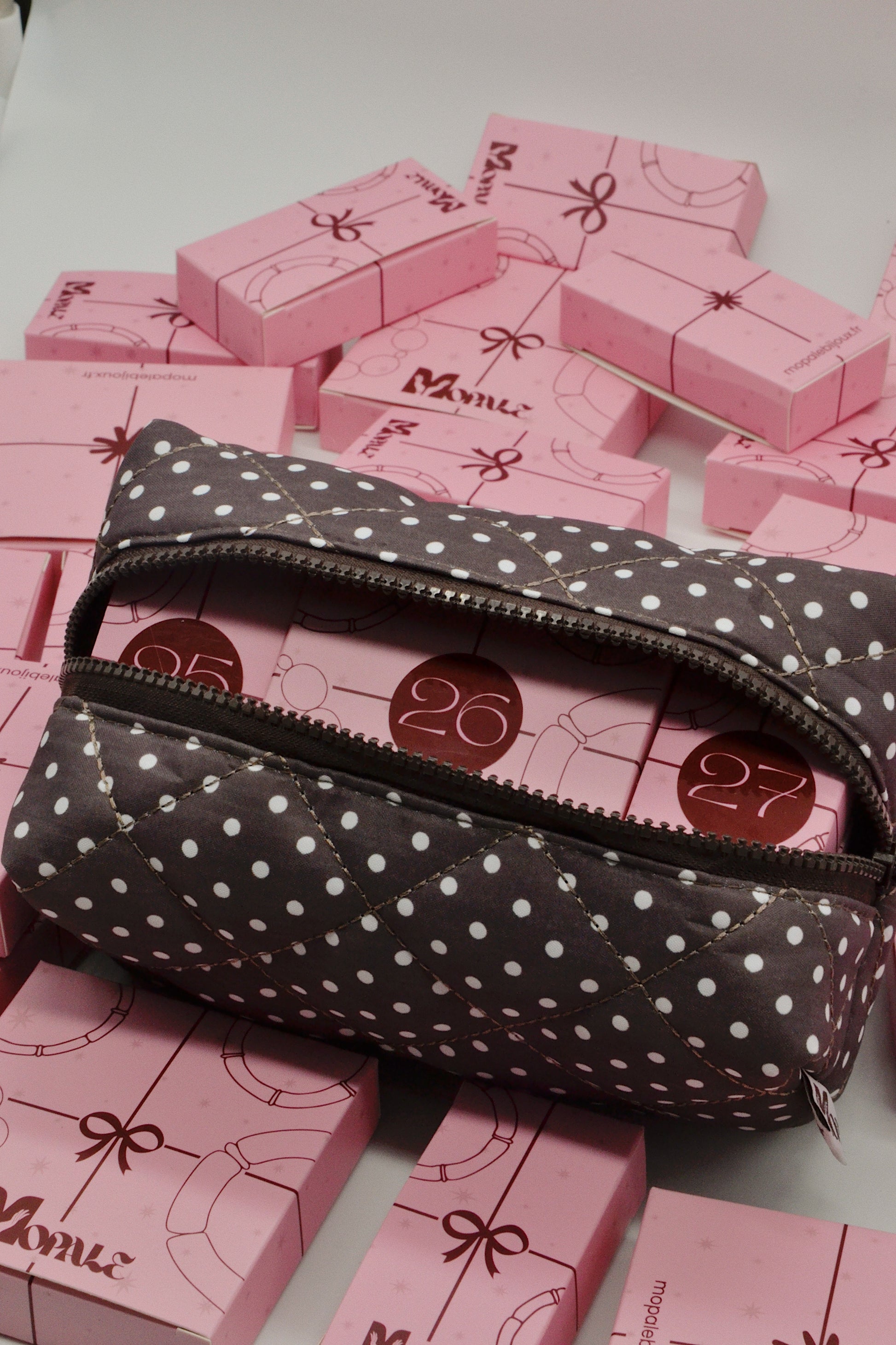 Du 25 au 31 décembre, prolongez la magie de Noël avec le calendrier de l’Après, présenté dans notre trousse marron à pois Mopale. Réutilisable et pratique, elle pourra vous accompagner toute l’année pour ranger vos bijoux ou vos produits.Ce calendrier contient 7 cases, à ouvrir chaque jour, avec à l’intérieur 6 bijoux exclusifs (des coloris jamais vus sur le site) et 1 carte cadeau.