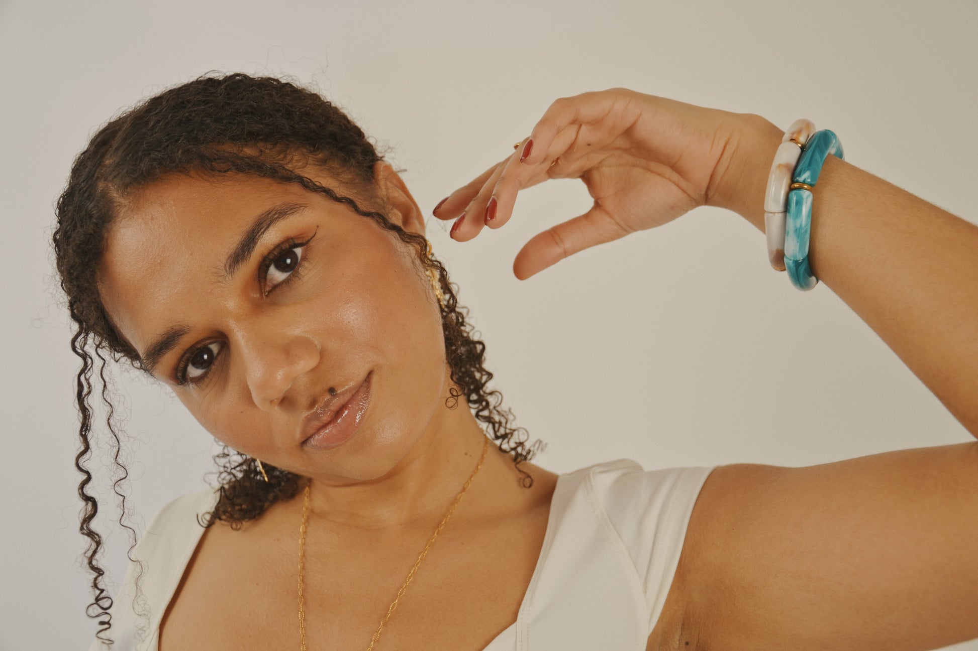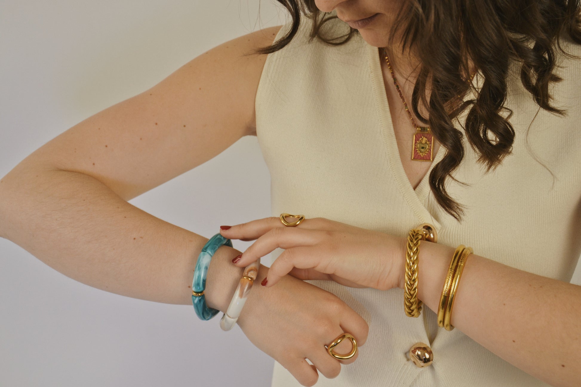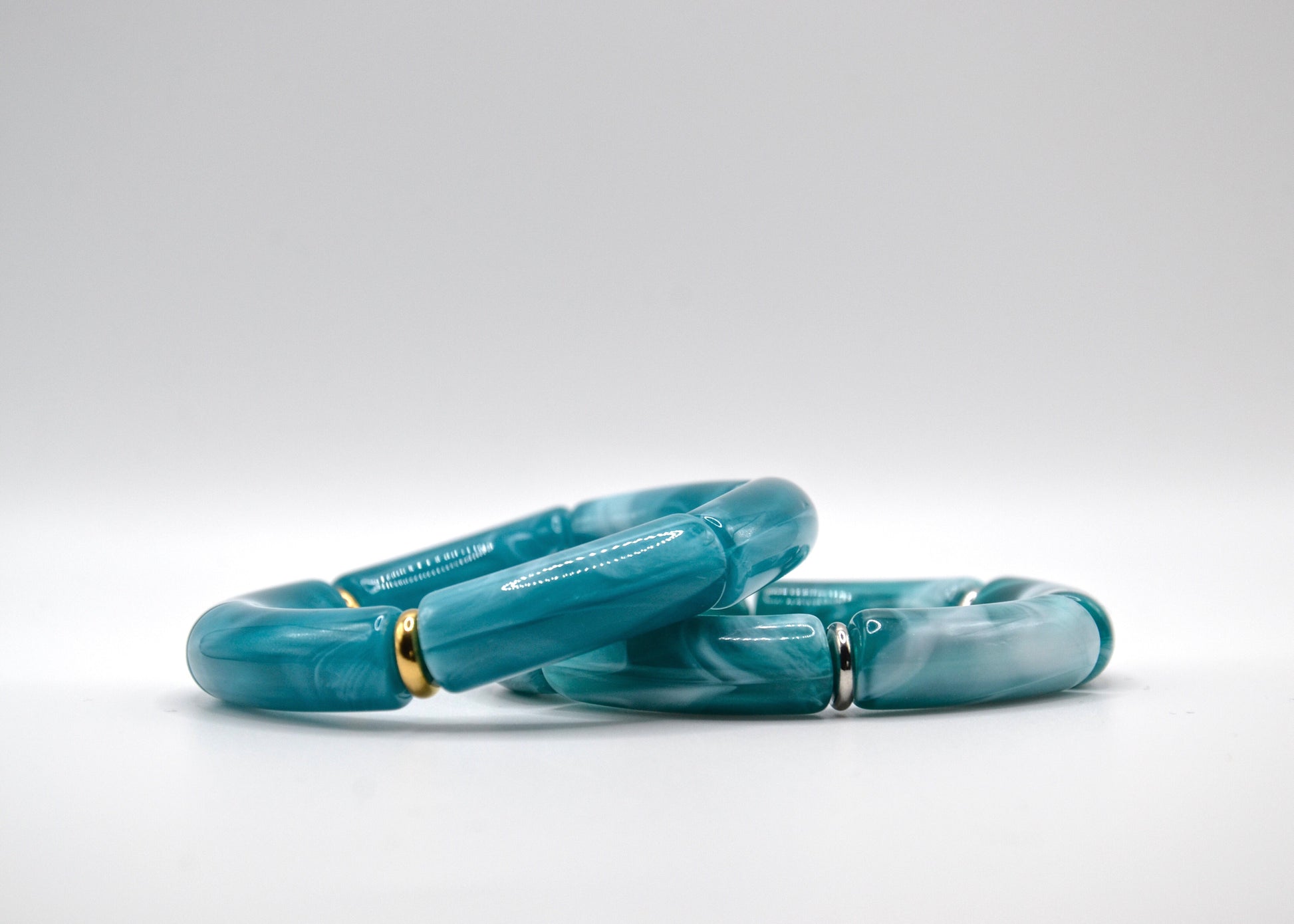 Le bracelet Thérèse est un bracelet solide qui est composé de tubes colorés et de perles lisses dorées ou argentées en acier inoxydable.